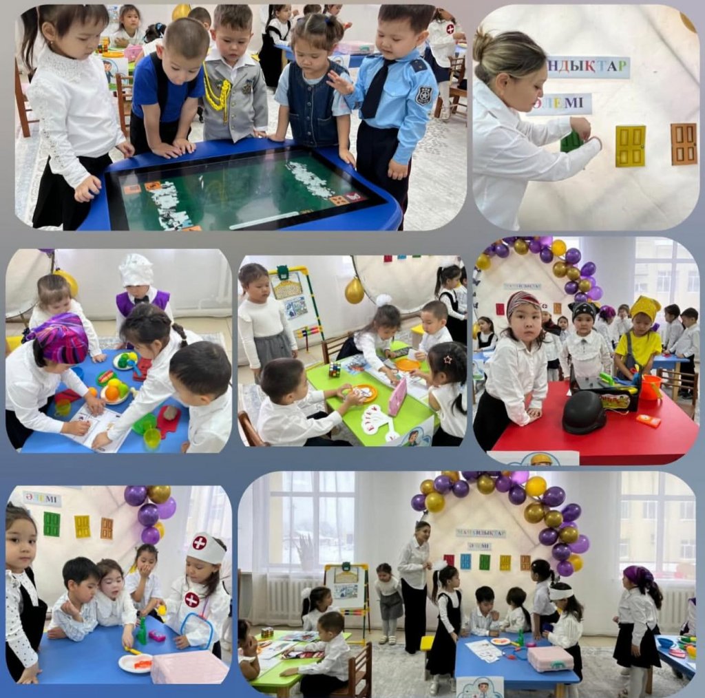 “Зерделі бала – ертеңгі дана” шағын орталық және мектепалды даярлық сыныптарының онкүндігі аясында «Құлпынай» тобында «Мамандықтар әлемі» атты ашық сабақ өткізілді.
